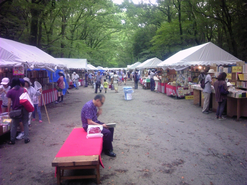 会場は下鴨神社にある糺ノ森の馬場です。よくニュースで流鏑馬なんかをしているところだと思います。その馬場の両側に38もの古書店が、テントを張って出店していました。